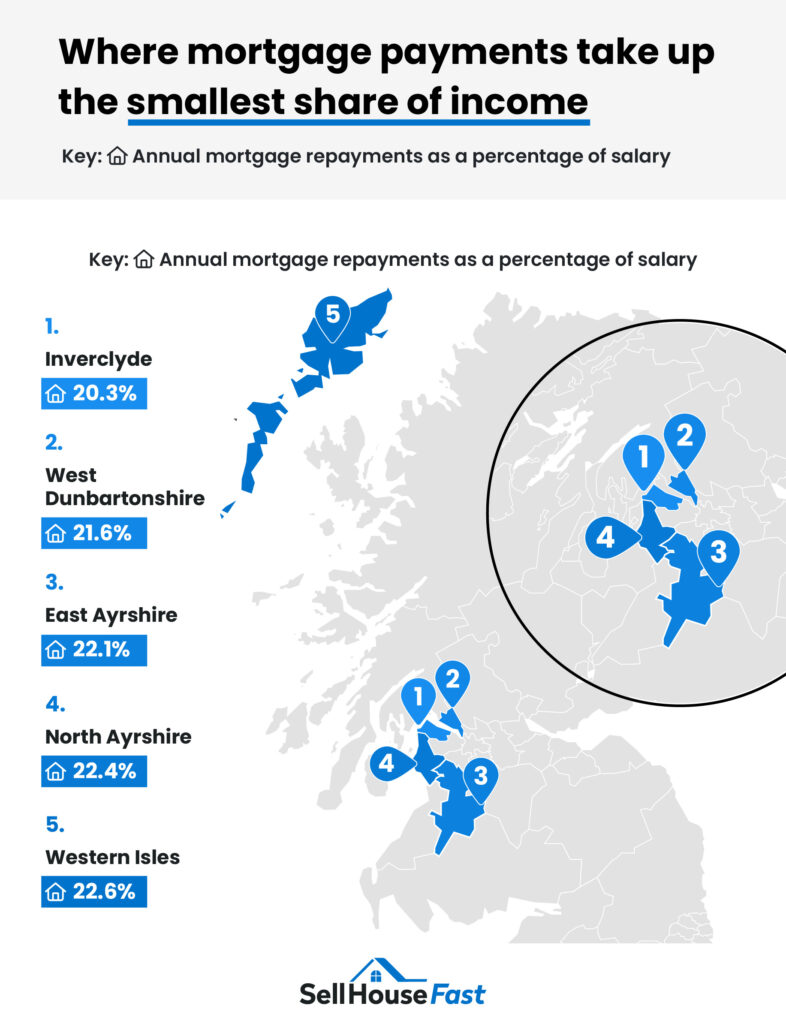 - Inverclyde – mortgage payments take up 20.3% of salary