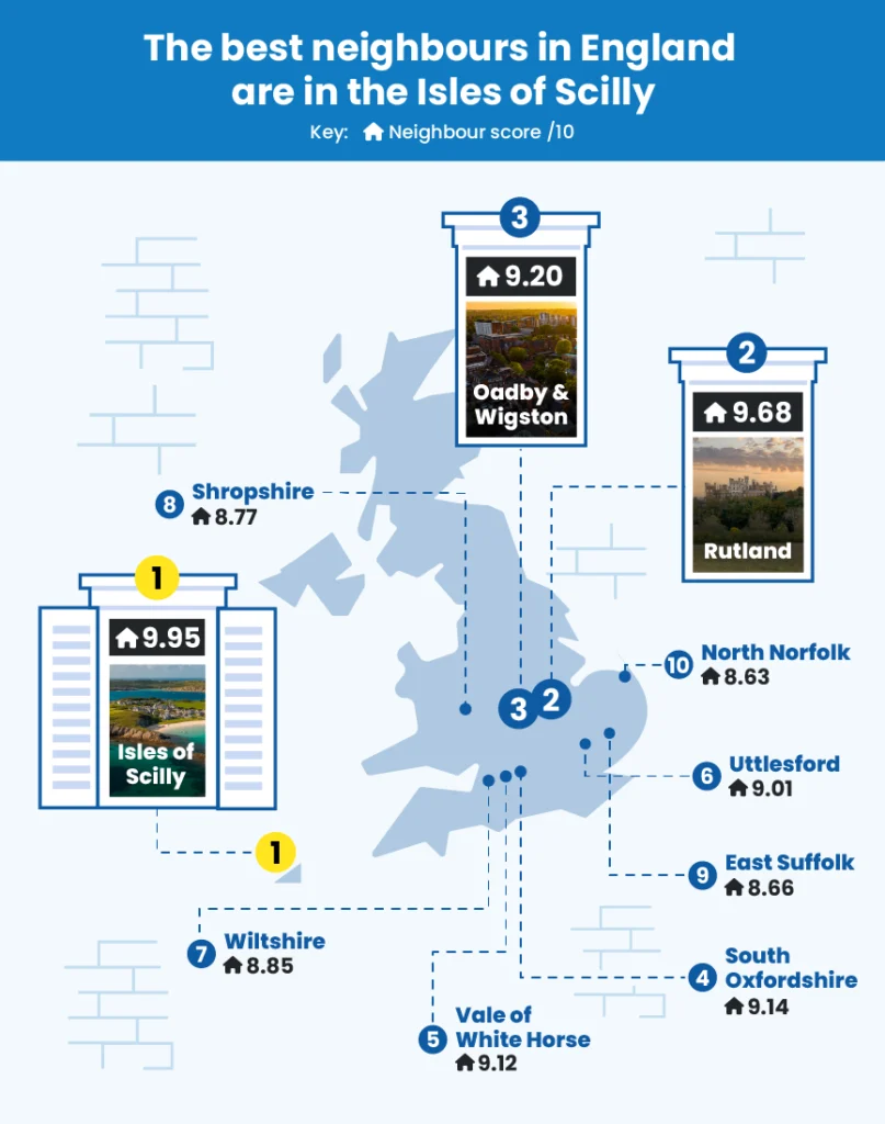 The least troubling neighbours in England can be found in the Isles of Scilly, scoring 9.95 out of 10. The area has the lowest crime rate, at just 28.1 per 1,000 people. The highest reported crime type for the year ending March 2025 was violence against the person. There were just 10 recorded instances per 1,000 people of this crime, which can include harassment and common assault.