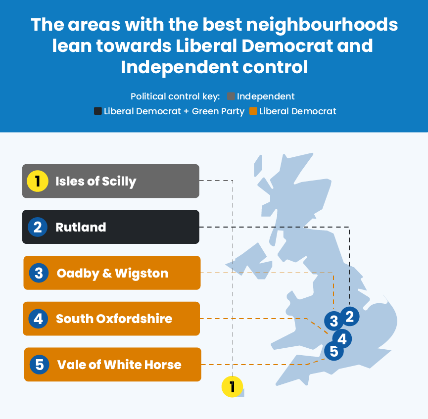 The areas with the best neighbourhoods lean towards Liberal Democrat and Independent control