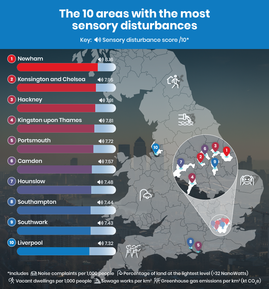 Unsurprisingly, London areas feature heavily in the top spots, taking up 70% of the 10 places with the most sensory disturbances.