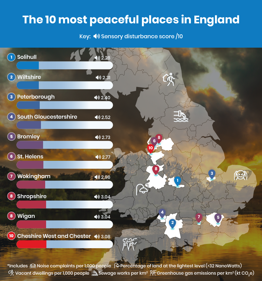 Solihull is the calmest area in England, scoring just 2.28 out of 10. Compared with major cities, residents here experience very little environmental disruption: