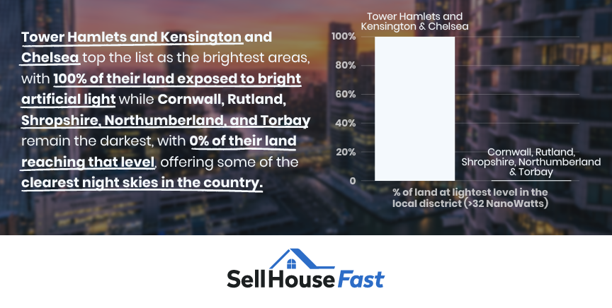 - Only 9.3% of land is affected by artificial light at night, meaning residents enjoy far darker skies than in most parts of England. By comparison, places like Kensington and Chelsea, and Tower Hamlets, are fully exposed to artificial light.