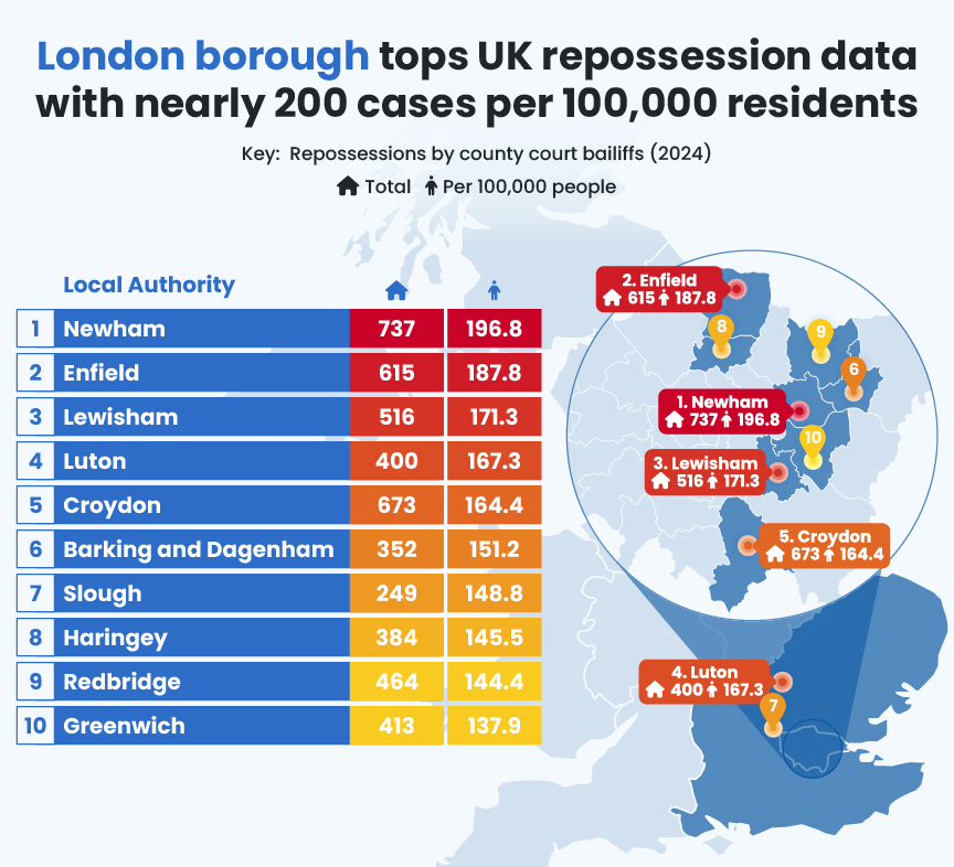 Newham recorded 737 completed repossessions in 2024, equivalent to 196.8 per 100,000 residents, demonstrating the highest rate nationally.