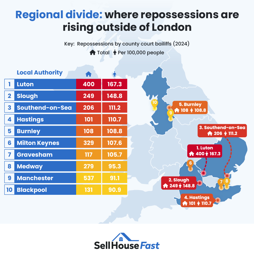 Luton records 167.3 repossessions per 100,000 residents, placing it fourth nationally overall and the highest outside London. Slough follows with 148.8 per 100,000. Both sit within high-density urban markets in the South East and East of England, where private renting forms a significant share of housing tenure.